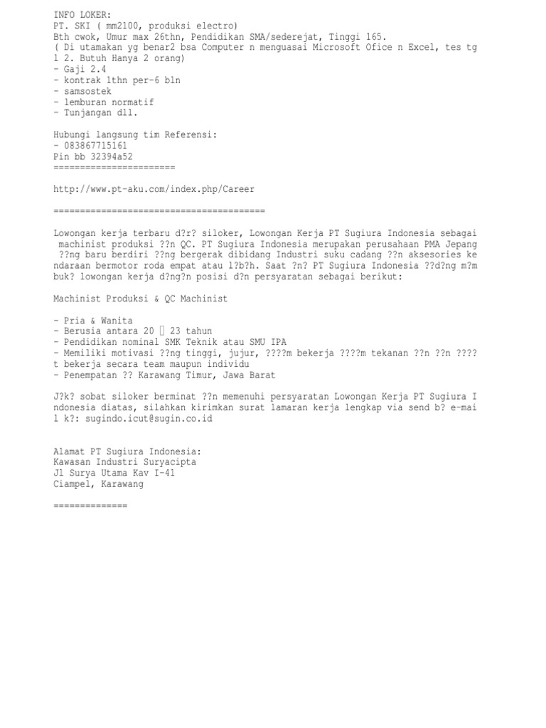 Contoh lowongan kerja menarik untuk kebutuhan. Lowongan kerja security pria (scr) pt ski group september 04, 2020. Lowongan kerja ini dibuka untuk minimal lulusan d3/d3. Rekrutmen lowongan kerja pt microsoft indonesia april 2021. Lowongan kerja pt nestle indofood citarasa indonesia. Sekarnusa kreasi indonesia (pt.ski) merupakan perusahaan nasional yang bergerak dalam industri kantong plastik. Fuji seiki indonesia adalah anak perusahaan dari fuji seiki group yang berpusat di jepang, dan mempunyai beberapa factory di negara lain. Lowongan kerja ini dibuka untuk minimal lulusan d3/d3. Fuji seiki indonesia adalah pma jepang yang berlokasi di bandung, bergerak di bidang manufacture, memproduksi part motor dan mobil/plastic injection molding. Cam shaft, starting gear, primary gear, outer clutch, idle shaft, clutch piston dan timing sproket. Pt redpath indonesia is a multinational company which employs more than 800 people in indonesia area. Saat ini perusahaan sedang membuka depo/gudang baru di daerah sokaraja purwokerto. Loker bumn 45 april 09, 2021.